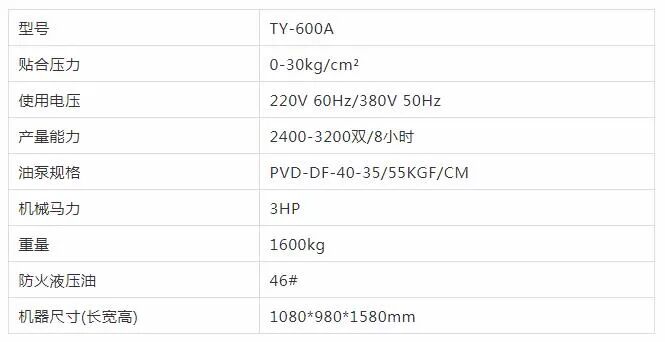 TY-600A水压机适用于休闲鞋及各种运动鞋之大底粘合工序。